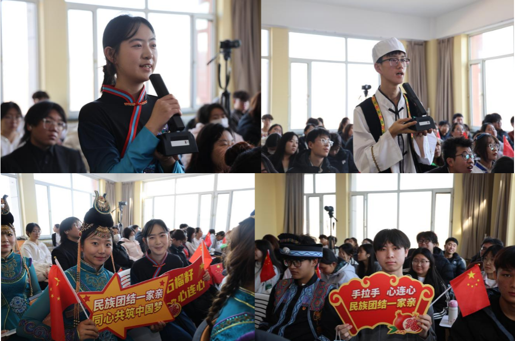 分享會上,來自納西族、水族、達斡爾族、土家族、朝鮮族的五名同學以溫情講述、多元互動為載體,分享了本民族的文化習俗,講述了在校園生活中與各民族同學互幫互助、同心筑夢的民族團結故事。她們運用真摯的話語、鮮活的事例分享了“中華民族一家親、同心共筑中國夢”的感人故事,引發全場師生強烈共鳴。活動期間,學校大學生藝術團以舞蹈《草原贊歌》為現場增添了熱烈的民族團結氛圍。