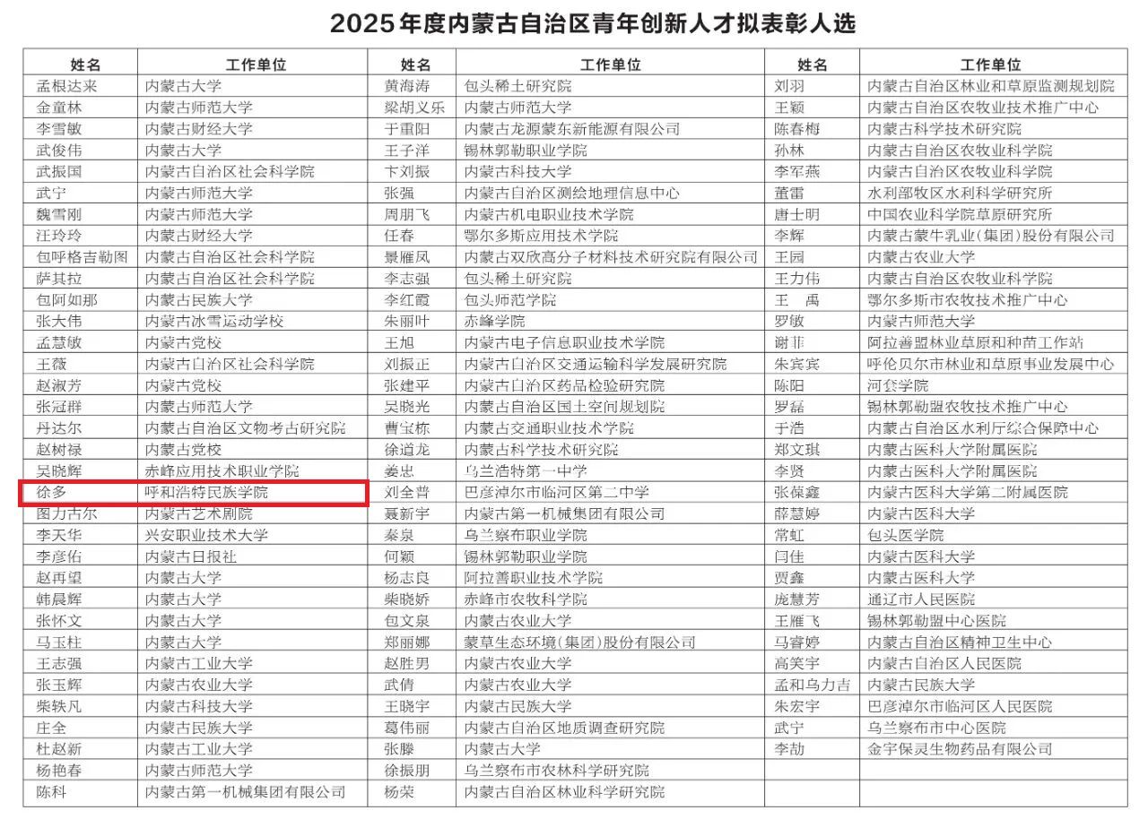 近日,2025 年度內蒙古自治區青年創新人才表彰名單正式公布,我校財務處副處長徐多憑借在學術研究、人才培養及財務管理領域的系統性創新成果與突出貢獻成功入選。