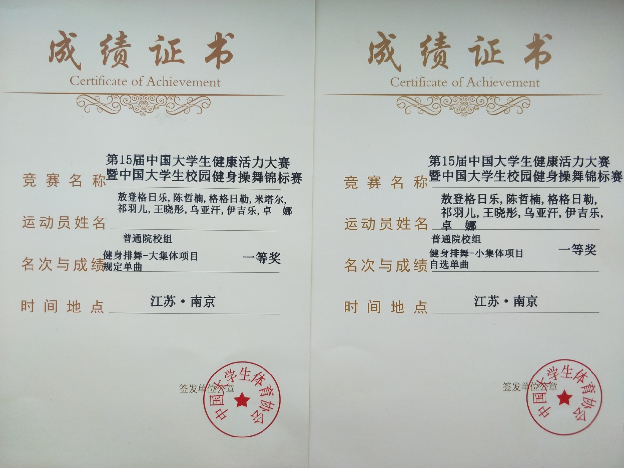 在此次比賽中,我校代表隊努力拼搏、開拓創(chuàng)新,用具有民族特色的舞姿贏得了全場觀眾和評委們的一致好評,最終獲得了普通院校組健身排舞大集體項目規(guī)定單曲一等獎,小集體項目自選單曲一等獎,三人榮獲三等獎的好成績。在全國性大賽中,為學(xué)校又一次爭得了榮譽(yù)。