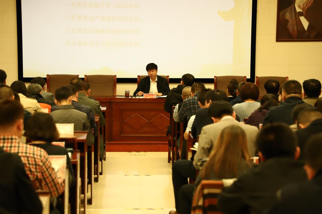 按照學校主題教育工作的安排,10月31日上午,學校黨委書記、主題教育領導小組組長孫國權在圖書館一樓報告廳講授了專題黨課。學校領導、副處級以上干部、黨支部書記及黨政辦支部全體成員共100余人參會。自治區第二批主題教育第九巡回指導組副組長梁樹德、成員白雪峰到會指導。