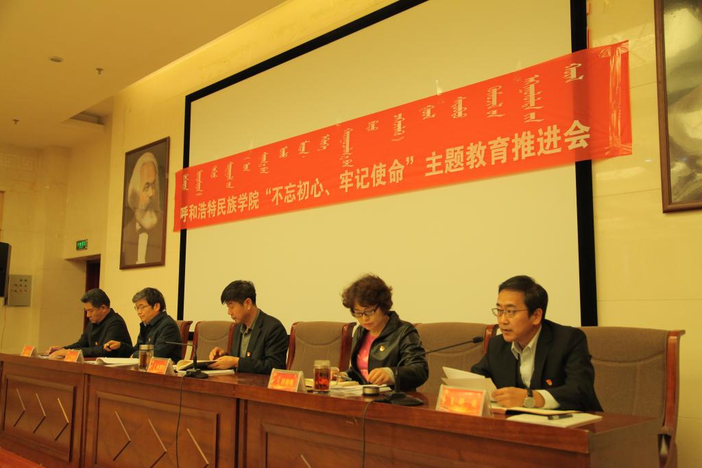 為進一步深入貫徹落實習近平總書記關于主題教育的重要講話、重要指示精神,貫徹落實中央和自治區第二批主題教育推進會精神,經報請自治區第二批主題教育第九巡回指導組同意,10月17日下午,學校在學習大講堂召開“不忘初心、牢記使命”主題教育推進會。校黨委書記孫國權,黨委副書記胡春梅,黨委委員、副校長阿拉坦倉,黨委委員、副校長賀希格吉雅,黨委委員、紀委書記朝克出席會議,副處級以上干部、各黨支部書記參加會議。會議由學校主題教育領導小組副組長、紀委書記朝克主持。