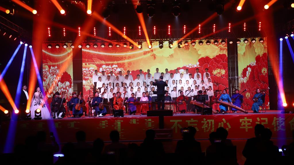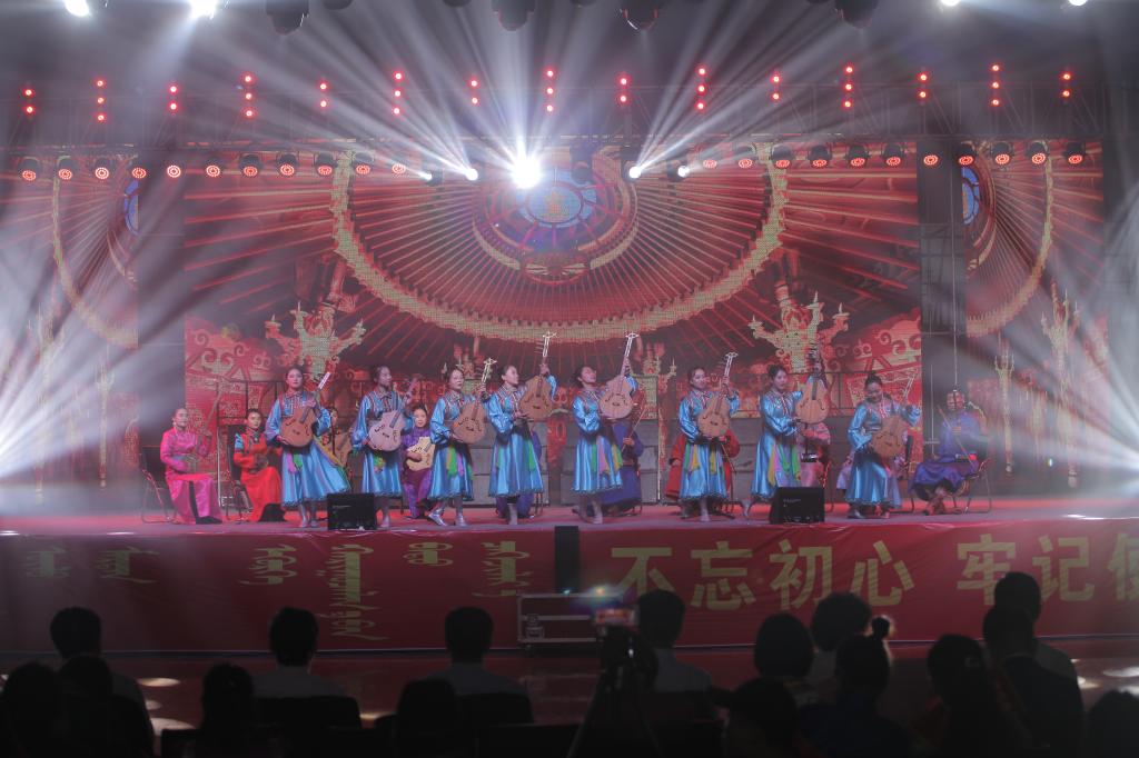 隨著《贊歌》激昂的旋律響起,拉開了整場晚會的帷幕。《“新思想”贊》《我愛你中國》《祖國,慈祥的母親》《七十年的陽光》《歌唱祖國》等曲目,用好來寶、齊唱、混聲合唱、重唱等多種演唱形式,表白了民院師生對偉大祖國的無比熱愛之情。民樂合奏《夢中的草原》、馬頭琴齊奏《初升的太陽》、合唱《美麗的草原我的家》、舞蹈《問候》,歌頌了綠色的大草原、壯美的內蒙古。大合唱《各族人民心連心》、獨唱《陽光路上》、笛子齊奏《策馬揚鞭運糧忙》、古箏齊奏《戰臺風》、舞蹈《馬背藍印》,表達了民院師生在習近平新時代中國特色社會主義思想指引下,民族團結一家親、同心共筑中國夢的堅定決心。整場演出高潮迭起,師生激情澎湃,始終洋溢著感恩黨情、謳歌祖國和催人奮進的主旋律。