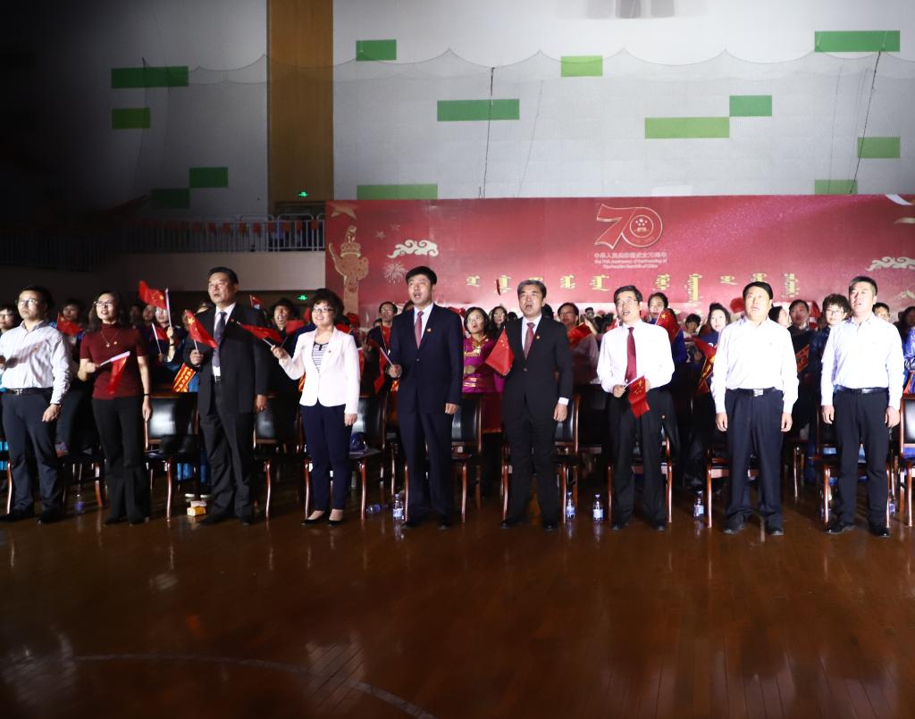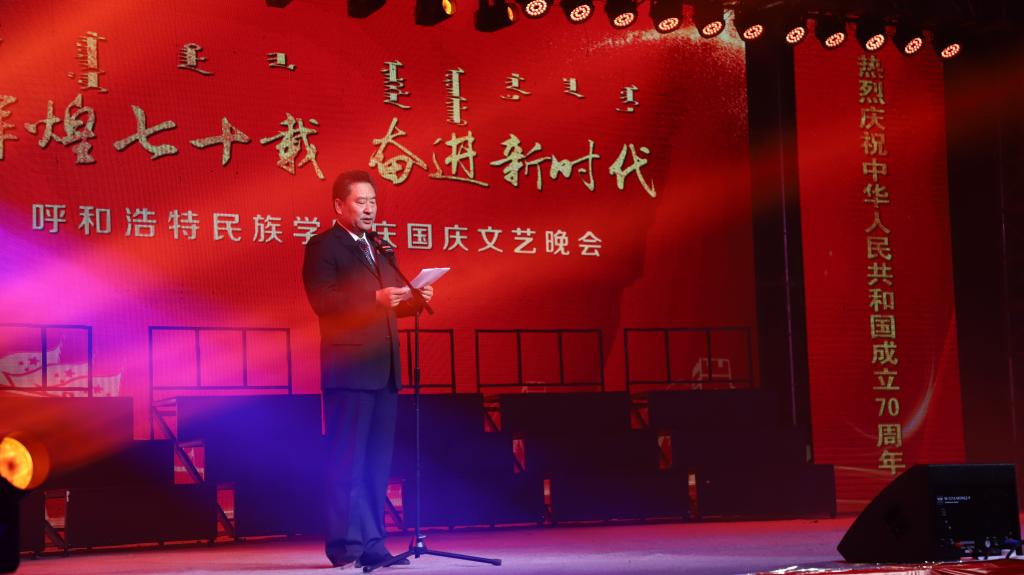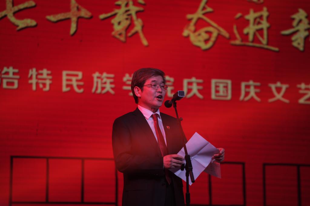 孫國權書記發表講話。他在講話中回顧了70年來在中國共產黨的領導下新中國走過的光輝歷程和我校建校66年來取得的發展成就。孫書記指出,當前我校正處在加快發展的關鍵時期,學校第二次黨代會為學校未來的發展謀劃了藍圖,明確了目標措施,全校上下要落實好“八大工程”和“八大建設”任務,發揚吃苦耐勞、勇往直前的蒙古馬精神,扎實工作,奮勇拼搏,共同譜寫學校發展的新篇章,為民族高等教育振興作出民院人應有的貢獻。孫書記號召,全校師生要緊密團結在以習近平同志為核心的黨中央周圍,進一步樹牢“四個意識”,堅定“四個自信”,做到“兩個維護”,與祖國和人民同呼吸,共命運,心連心,堅守初心不動搖,踐行使命勇擔當,奮力開創呼和浩特民族學院更加美好的明天,為建設亮麗內蒙古、共圓偉大中國夢而努力奮斗。