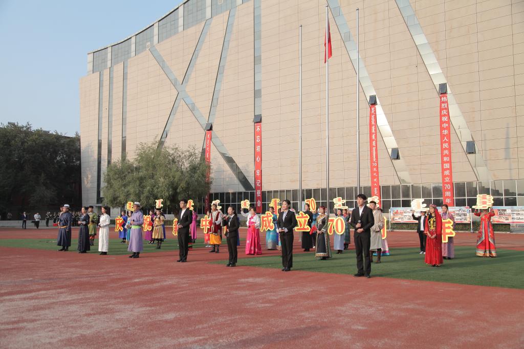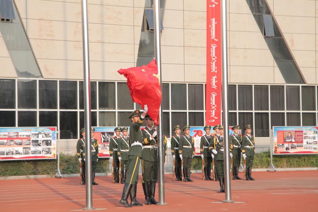 為慶祝中華人民共和國成立 70 周年,唱響禮贊新中國、奮進新時代的青春主旋律,弘揚愛國精神,我校于9月29日早在學校體育場舉行隆重的迎國慶升國旗儀式。學校黨委書記孫國權,黨委副書記、校長格日樂圖,黨委副書記胡春梅,黨委委員、副校長阿拉坦倉出席儀式,各職能部門負責人,二級學院黨總支書記、院長、團總支書記、專任教師、輔導員以及近4000名學生參加了儀式。