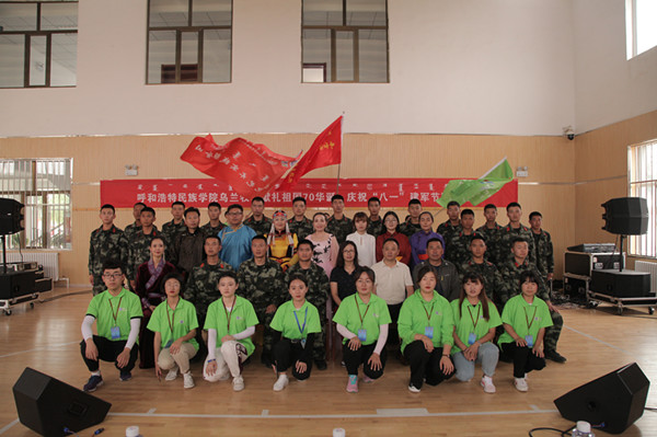 我校烏蘭牧騎隊員與當?shù)伛v軍合影