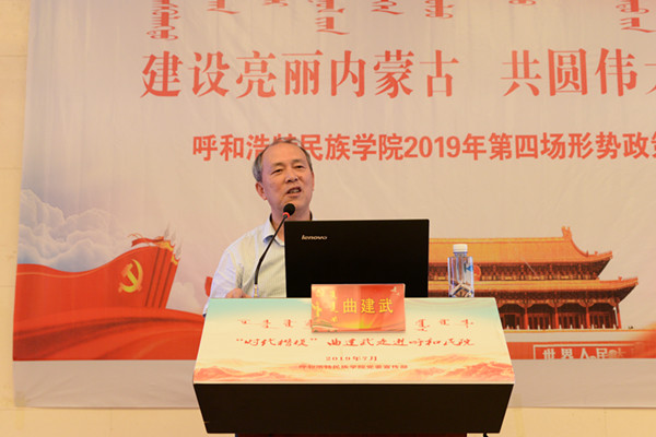 7月5日,我校2019年第四場形勢政策報(bào)告會(huì)、黨委中心組第七次擴(kuò)大學(xué)習(xí)會(huì)及處級干部培訓(xùn)班在學(xué)校學(xué)習(xí)講堂隆重舉行。本次報(bào)告會(huì)特邀請了“時(shí)代楷模”“全國師德標(biāo)兵”“全國優(yōu)秀教師”大連海事大學(xué)曲建武教授為師生作了以《給學(xué)生心靈埋下真善美的種子》為主題的報(bào)告。內(nèi)蒙古黨委高校工委、自治區(qū)教育廳思想政治與學(xué)生工作處包革命同志應(yīng)邀參加,校黨委副書記胡春梅,黨委委員、副校長阿拉坦倉,副校長納麗娜,黨委委員、紀(jì)委書記朝克出席會(huì)議,黨委委員、宣傳部部長王玉玲主持報(bào)告會(huì)。