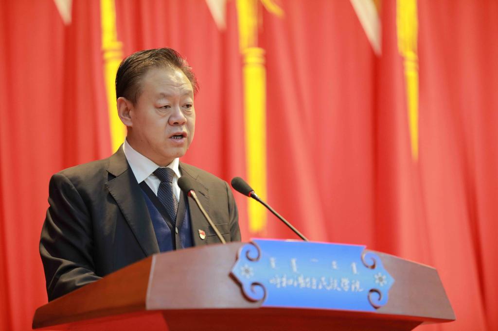 竇廳長代表高校工委發表講話。在講話中,竇廳長充分肯定和高度評價了我校過去五年的工作,他指出,過去五年來,在自治區黨委和政府的堅強領導下,呼和浩特民族學院黨委團結帶領全體黨員和師生員工,高舉中國特色社會主義偉大旗幟,認真學習貫徹習近平新時代中國特色社會主義思想和黨的十八大、十九大精神,全面貫徹黨的教育方針和民族政策,堅持社會主義辦學方向,緊緊圍繞立德樹人根本任務,落實創新、轉型、內涵、開放、和諧的發展理念,大力實施“特色立校、質量興校、人才強校”戰略,積極深化各項改革,不斷加強內涵建設,穩步推進轉型發展,著力優化發展環境條件,黨的建設得到全面加強,教育教學質量得到提升,在人才培養、科學研究、社會服務、文化傳承創新等方面都取得了顯著的成績,學校各項事業取得了較快發展。