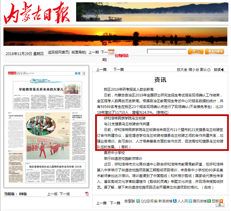 11月24日,我校烏蘭牧騎與21家旗縣烏蘭牧騎舉行舉行簽字儀式,并就下一步合作共建進行交流座談。連日來,內蒙古廣播電視臺、呼和浩特廣播電視臺、《內蒙古日報》(蒙漢文版)、《北方新報》、《呼和浩特日報》、《呼和浩特晚報》、新華網、中國新聞網、呼和浩特新聞網、呼和浩特廣播電臺等12家自治區主流媒體對活動進行了報道,內蒙古新聞網、新浪網等8家媒體進行了轉載報道。通過媒體的廣泛關注,進一步展示我校烏蘭牧騎隊伍的風采,提高了我校烏蘭牧騎的影響力。