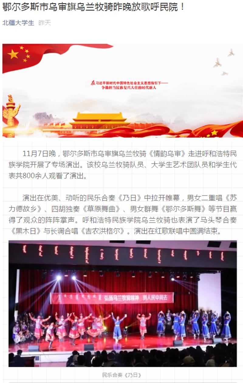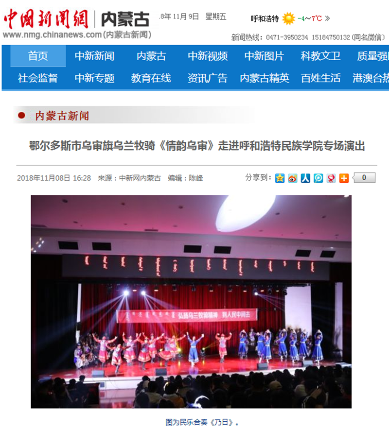 11月7日,鄂爾多斯市烏審旗烏蘭牧騎《情韻烏審》來我校開展專場演出。本場演出體現(xiàn)出濃郁的鄂爾多斯風情和鮮明的烏蘭牧騎特色,具有藝術(shù)性和觀賞性,受到現(xiàn)場師生的喜愛。 中國新聞網(wǎng)、呼和浩特新聞網(wǎng)、北疆大學生、內(nèi)蒙古旅游融媒體對活動進行了專題報道。