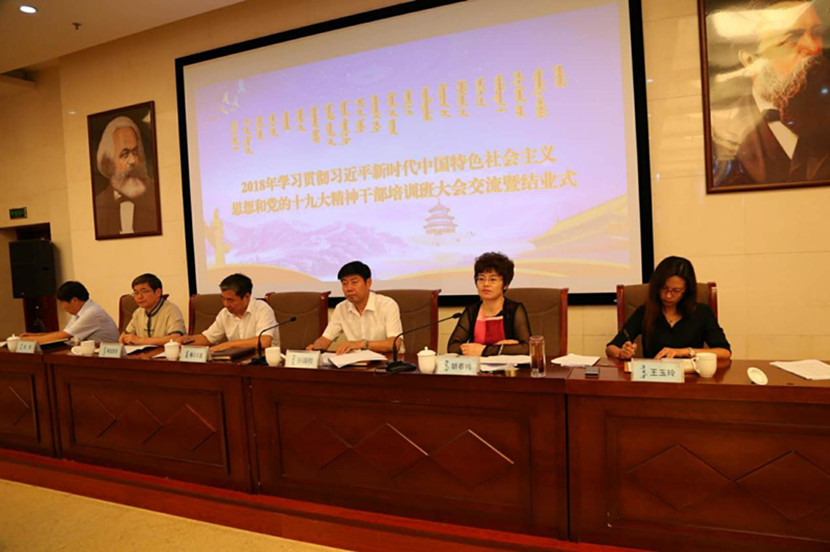 8月31日下午,學校黨委在圖書館一樓報告廳舉行“2018年學習貫徹習近平新時代中國特色社會主義思想和黨的十九大精神干部培訓班”結業式。學校黨委書記孫國權、院長格日樂圖、黨委副書記胡春梅、副院長阿拉坦倉、黨委委員包君、黨委委員王玉玲出席大會,黨委副書記胡春梅主持,處級、科級干部共136人參加了本次結業式。
