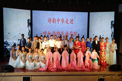 為深入貫徹落實(shí)習(xí)近平新時(shí)代中國(guó)特色社會(huì)主義思想和黨的十九大精神,著眼于培育擔(dān)當(dāng)民族復(fù)興大任的時(shí)代新人,切實(shí)加強(qiáng)中華優(yōu)秀傳統(tǒng)文化教育,在自治區(qū)黨委宣傳部統(tǒng)一安排下,大型詩(shī)歌音樂舞蹈史詩(shī)《詩(shī)韻中華》于8月30日走進(jìn)我校,自治區(qū)黨委宣傳部副部長(zhǎng)高文鴻、高校企業(yè)處副處長(zhǎng)竇鵬程、世界華語(yǔ)詩(shī)歌聯(lián)盟創(chuàng)始人李黎、學(xué)校黨委書記孫國(guó)權(quán)、黨委副書記胡春梅、副院長(zhǎng)阿拉坦倉(cāng)出席觀看,教師、學(xué)生代表共計(jì)600余人觀看演出。