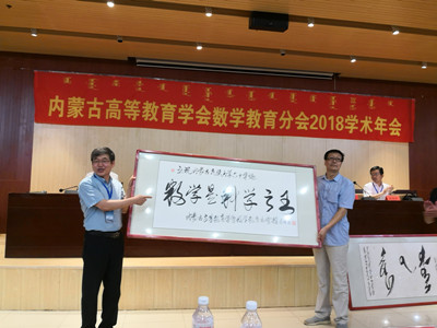 阿拉坦倉教授在致辭中首先感謝國防科技大學(xué)朱建民教授、渤海大學(xué)張盛教授前來參加年會,感謝內(nèi)蒙古民族大學(xué)承辦本次年會,同時對鼎力支持分會發(fā)展的內(nèi)蒙古自治區(qū)教育廳、內(nèi)蒙古高等教育學(xué)會、高等教育出版社數(shù)學(xué)分社、中軟國際教育集團(tuán)和全區(qū)各高校數(shù)學(xué)院系及學(xué)界同仁表示感謝。阿拉坦倉教授簡要總結(jié)分會成立以來開展的活動和取得的成績,分會先后主辦著名數(shù)學(xué)家張恭慶院士報告會、四屆全國高校數(shù)學(xué)微課程教學(xué)設(shè)計競賽內(nèi)蒙古分賽區(qū)比賽、內(nèi)蒙古高校數(shù)學(xué)教師微課程培訓(xùn)會、2017年高校數(shù)學(xué)教學(xué)暑期培訓(xùn)暨第三屆華北賽區(qū)微課競賽頒獎會等活動;2017年由分會推送的數(shù)學(xué)微課程作品取得華北賽區(qū)特等獎3名、一等獎4名、二等獎10名和全國決賽中榮獲二等獎3名的好成績。最后,阿副院長指出,在“四有教師”指向和“四個回歸”理念下,高校數(shù)學(xué)教師應(yīng)該以數(shù)學(xué)教學(xué)模式與教學(xué)方法的創(chuàng)新為突破口,在課堂教學(xué)實(shí)踐中凝練出自己獨(dú)特的教學(xué)理念和思想,全面推動課堂教學(xué)能力與教學(xué)科學(xué)研究的發(fā)展。阿拉坦倉教授致辭后代表分會向內(nèi)蒙古民族大學(xué)及內(nèi)蒙古民族大學(xué)數(shù)學(xué)科學(xué)學(xué)院分別贈送書法作品,祝賀內(nèi)蒙古民族大學(xué)建校六十華誕。