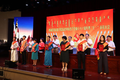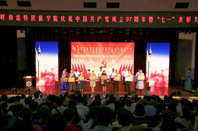 會議在莊嚴的國歌中拉開序幕。會上,賀希格吉雅副院長宣讀了《呼和浩特民族學院關于表彰優秀共產黨員、優秀黨務工作者、先進黨總支、先進黨支部、“兩學一做”支部風采展示優秀作品的決定》,校領導向受表彰的49名優秀個人、14個先進黨組織頒發了獎狀、獎牌。美術系黨總支副書記包旭東、馬克思主義學院教師薩仁通拉嘎、經濟系學生白茹雪分別代表先進黨組織、優秀黨務工作者和優秀共產黨員發言。學校黨委副書記胡春梅以《提升政治站位,立足本職工作,做好黨建工作質量提升年各項工作》為題發表講話,圍繞建黨97周年、改革開放40周年、建校65周年,論述了黨的發展歷程、改革開放以及建校以來學校所取得的成績,并代表黨委向學校基層黨組織和全體黨員提出了幾點要求:一是提升政治站位,加強理論學習;二是提升基層黨建工作質量,發揮基層黨組織堡壘作用;三是以理想信念為根本,加強黨員干部的教育管理;四是加強黨性鍛煉,充分發揮黨員模范作用。