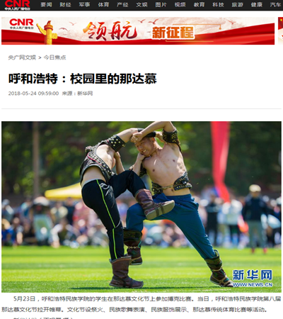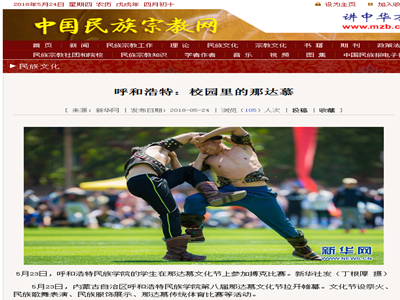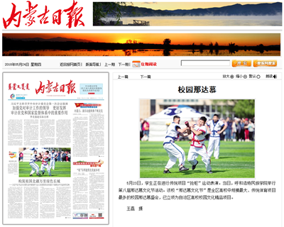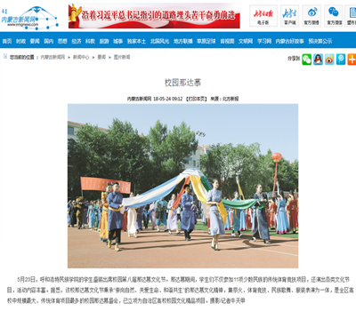經學校黨委宣傳部的大力推廣和團委、網絡中心、保衛處、后勤管理處、體育系等部門的協助,本次那達慕文化節的媒體宣傳工作實現了歷史性突破。截止到5月28日,共有30家新聞媒體進行了專題報道,媒體覆蓋廣度和宣傳報道力度是建校以來之最。其中,《中國日報》(英文名稱《China Daily》,全球發行,期均90余萬份)在顯要位置以圖片新聞報道;《中國青年報》《內蒙古日報》(蒙古語、漢語版)《呼和浩特日報》《北方新報》《呼和浩特晚報》《內蒙古晨報》7家報紙媒體進行了頭版報道,《內蒙古日報》(蒙古語版)整版報道;內蒙古衛視2個電視頻道,新華社、人民網、光明網、新華網、中國新聞網等11家網站,中央人民廣播電臺、中國蒙古語廣播電臺、內蒙古廣播電臺蒙古語頻道、呼和浩特新聞廣播等3家電臺,影像內蒙古、北疆大學生、內蒙古客戶端、內蒙古日報等4家主流微信公眾號進了報道;新浪網、網易網、中國民族宗教網、《山西日報》等僅百余網站、媒體進行了轉載報道。
