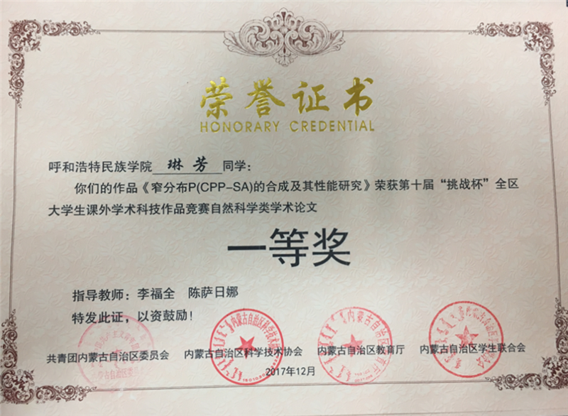 近日,第十屆“挑戰(zhàn)杯”全區(qū)大學(xué)生課外學(xué)術(shù)科技作品競賽成績揭曉。學(xué)校選送的27件作品,經(jīng)過初審、復(fù)審和終審問辯等環(huán)節(jié),共有7件作品獲獎,其中我校學(xué)生琳芳的作品《窄分布P(CPP-SA)的合成及其性能研究》榮獲一等獎,6件作品榮獲三等獎。
