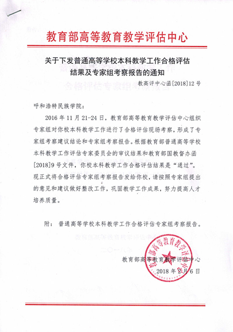 近日,教育部高等教育教學評估中心下發了《關于下發普通高等學校本科教學工作合格評估結果及專家組考察報告的通知》(教高評中心函[2018]12號),根據教育部普通高等學校本科教學工作評估專家委員會的審議結果和教育部國教督辦函[2018]9號文件,我校本科教學工作合格評估結果為“通過”,學校自2009年升本以來的教學工作正式得到了教育部的肯定。