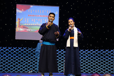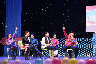 一場盛大絢麗的民族服飾秀拉開了晚會的帷幕。同學們身著華麗的蒙古袍展示了蒙古族服飾文化的精妙;題為“傳媒系大學生共話十九大”的舞臺劇將師生關注的十九大的內容搬上了舞臺,同學們以師生互動的演繹方式表達了少數民族大學生對十九大的關注和師生喜迎十九大的激動心情;“配音表演節目”由播音與主持藝術專業的同學精心策劃和演出,他們用鮮活幽默的語言表達了我系大學生對十九大的熱切關注。傳媒系師生以民族特色十足的歌舞、詩歌朗誦、小型舞臺劇、小品、配音表演、小視頻展播等多種表演形式表達了對黨的熱愛和對黨的事業的支持。