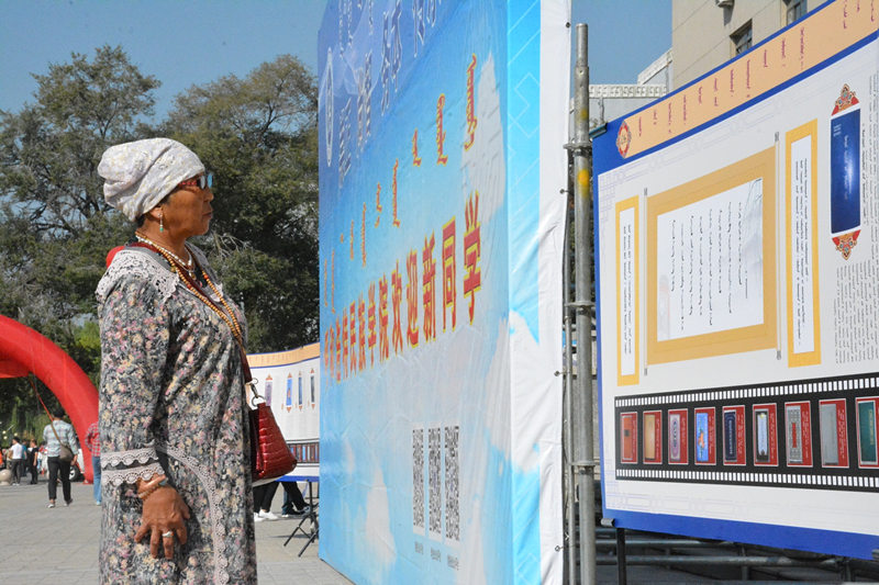 新生家長在認(rèn)真閱讀蒙文展板