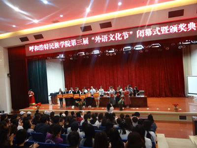 由校團委、外語系主辦,高等教育出版社贊助的呼和浩特民族學院第三屆“外語文化節”閉幕式于2017年6月24日在圖書館二樓報告廳舉行。學校黨委副書記胡春梅出席閉幕式,高等教育出版社外語與國際漢語出版事業部周俊華副主任、高等教育出版社內蒙古教學服務中心劉永平主任、電子科技大學呂汀副教授、南京大學外國部裴麗萍講師應邀出席。學生處處長楊福梅、外語系黨總支布和朝魯書記、外語系肖查娜主任、黨總支紅梅副書記,以及外語系全體教師和2014級、2015級、2016級全體學生參加了此次閉幕式。