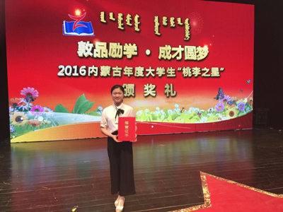 6月16日晚,“敦品勵學·成才圓夢”——2016內蒙古年度大學生“桃李之星”頒獎活動在內蒙古大學舉行,10名“桃李之星”稱號獲得者和20名提名獎獲得者受到表彰。我校外語系趙圓同學榮獲提名獎。