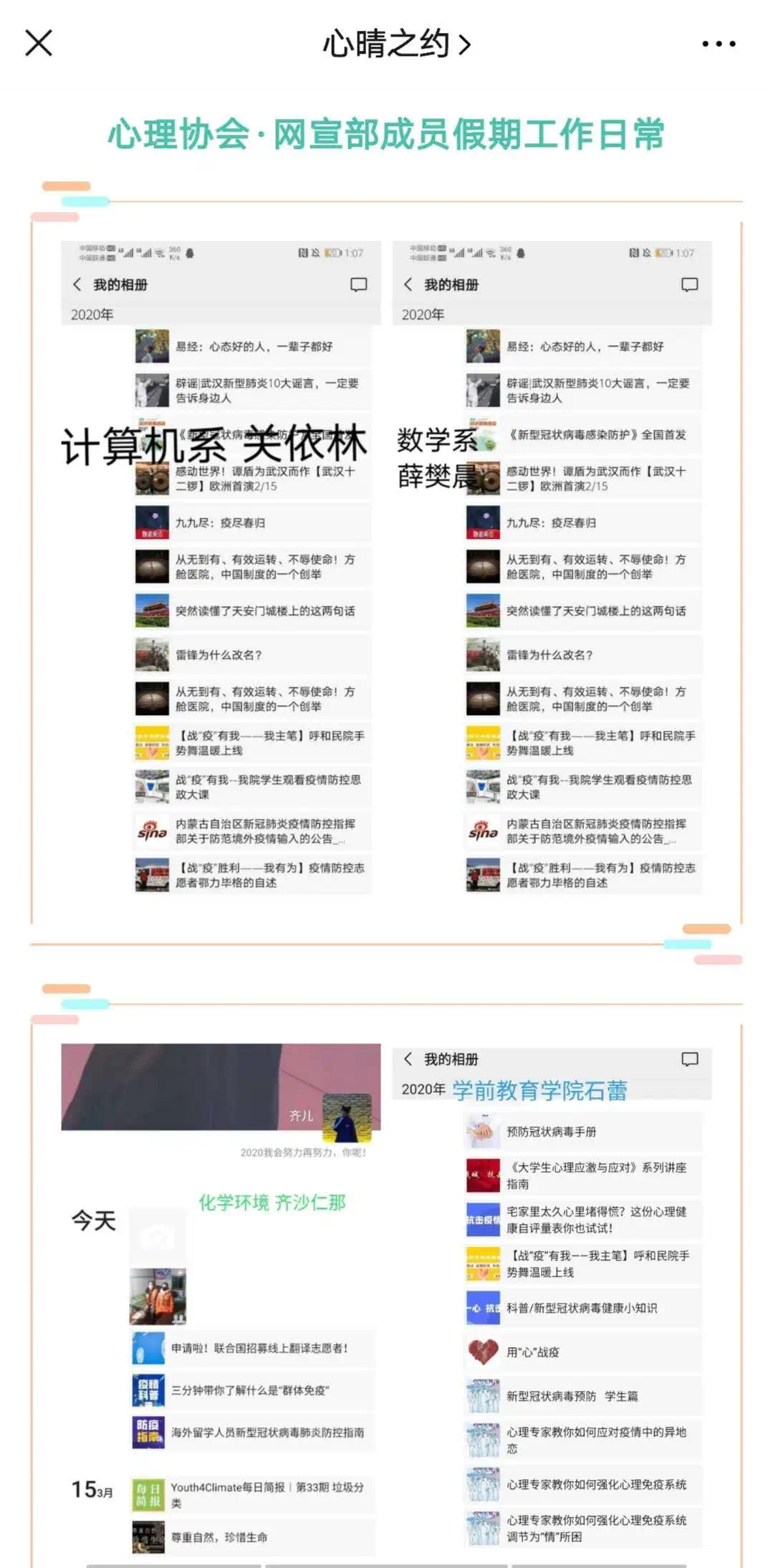 在疫情期間,我校師生仍然堅守工作崗位,利用網絡資源,進行網上學習在線辦公,充分展現了我校學生疫情期間的學習工作風采。心理委員積極投身于志愿者服務行列,幫助社區開展防疫工作,用自己的行動在疫情期間寫下了熱心積極的青春物語。同時,他們也將自己的心靈寄語記錄下來,為我校師生樹立了榜樣,鼓勵同齡人認真學習努力工作,積極應對新冠肺炎。
