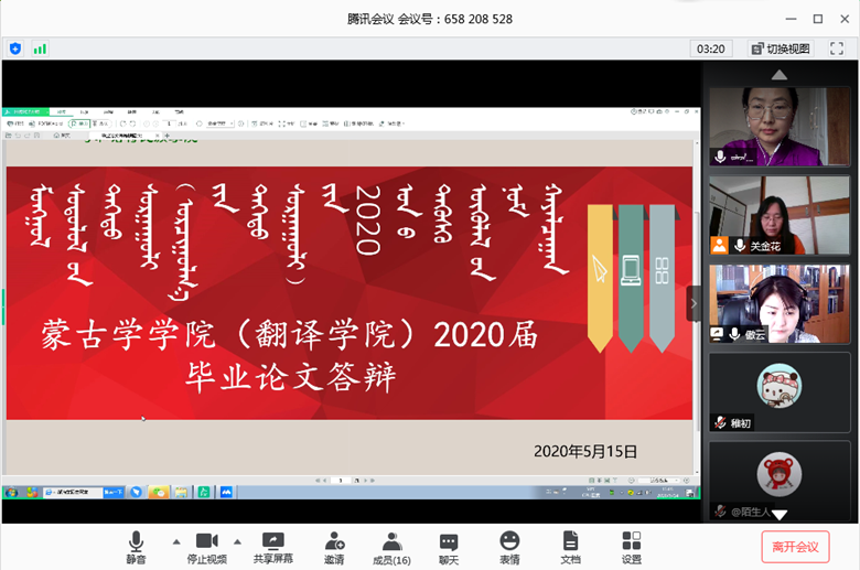 為了保證2020屆學生能夠順利完成畢業論文并按時畢業,考慮到新冠肺炎疫情影響,結合學校有關疫情工作文件精神,在前期論文指導的基礎上,蒙古學學院(翻譯學學院)采取了線上答辯的形式。此次線上答辯工作經過周密安排,形成《蒙古學學院(翻譯學學院)線上畢業論文答辯工作實施方案》,并將答辯形式、答辯流程、答辯注意事項及分組情況提前發給學生,錄制演示視頻,幫助學生熟悉線上答辯操作。