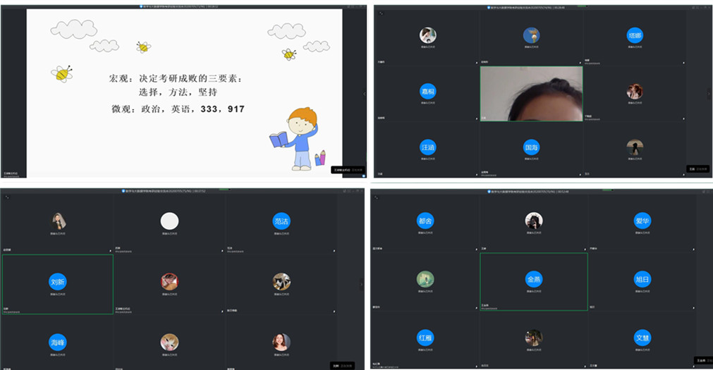 交流會(huì)由王海清院長(zhǎng)講話,他強(qiáng)調(diào)在這樣特殊時(shí)期,同學(xué)們要掌握有效的學(xué)習(xí)方法,積極與輔導(dǎo)教師和往屆考研生交流溝通,通過(guò)自律提高學(xué)習(xí)效率,加倍努力,堅(jiān)持到底。隨后,受邀的四名同學(xué)分別發(fā)言,從如何選擇學(xué)校、如何選擇專業(yè)以及專業(yè)課、英語(yǔ)、政治等課程的學(xué)習(xí)方法等方面做了詳細(xì)敘述。在發(fā)言中,四名同學(xué)都認(rèn)為正確的學(xué)習(xí)方法和堅(jiān)持不懈的努力是取得優(yōu)異成績(jī)的重要法寶,再加上科學(xué)的規(guī)劃,選擇合適的復(fù)習(xí)資料可以增加成功的概率。在生活上,四名同學(xué)也給出了寶貴的建議。她們建議通過(guò)散步、與家人和朋友溝通來(lái)緩解壓力。接著,專業(yè)課輔導(dǎo)教師團(tuán)隊(duì)成員金國(guó)海老師結(jié)合自身經(jīng)歷,從考研戰(zhàn)略、戰(zhàn)術(shù)以及克服懶惰和畏難心理等三個(gè)方面講述如何備戰(zhàn)。他強(qiáng)調(diào)根據(jù)自身實(shí)際,合理安排時(shí)間,制定科學(xué)可行的復(fù)習(xí)計(jì)劃,嚴(yán)格按照計(jì)劃執(zhí)行,要有信心戰(zhàn)勝考研這場(chǎng)持久戰(zhàn)。最后,互動(dòng)環(huán)節(jié)中同學(xué)們積極提問(wèn),溝通交流。