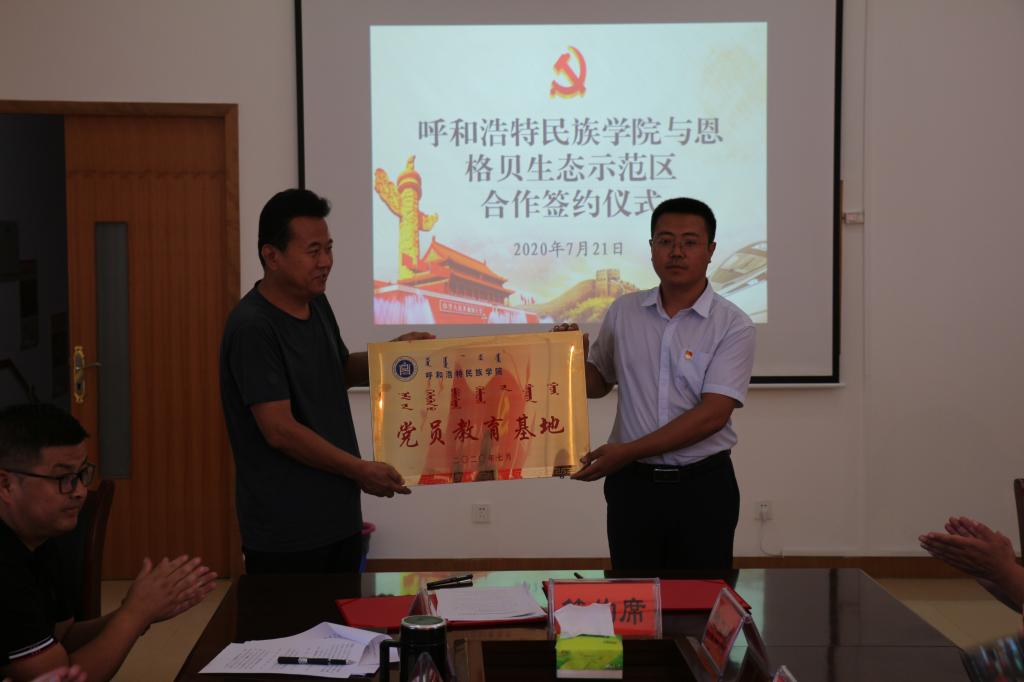 首先,趙興國(guó)主任對(duì)我校行政總支書記包倉(cāng)一行表示了熱烈歡迎,他指出,我校前期開展的院級(jí)實(shí)習(xí)實(shí)訓(xùn)和就業(yè)工作中取得的成績(jī)是為本次建立校地合作打下了扎實(shí)的基礎(chǔ)。希望通過此次建立校地合作能夠更好地推進(jìn)恩格貝生態(tài)示范區(qū)各項(xiàng)工作的發(fā)展,并為學(xué)校人才培養(yǎng)工作做出積極貢獻(xiàn)。隨后,包倉(cāng)書記與趙興國(guó)主任代表雙方簽署了就業(yè)實(shí)訓(xùn)、勞動(dòng)教育和黨員教育基地三項(xiàng)合作協(xié)議書。黨總支委員代表與部門相關(guān)領(lǐng)導(dǎo)分別向示范區(qū)授予 “呼和浩特民族學(xué)院黨員教育基地”“呼和浩特民族學(xué)院就業(yè)實(shí)訓(xùn)基地” “呼和浩特民族學(xué)院大學(xué)生勞動(dòng)教育基地”牌匾。