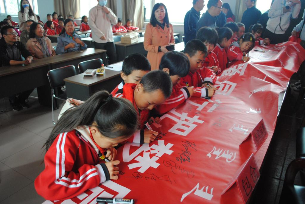 捐贈儀式結束后,與會領導及來賓、旗下營中心學校師生代表在“民族團結進校園 與愛同行把夢圓”的條幅上簽名。