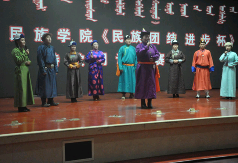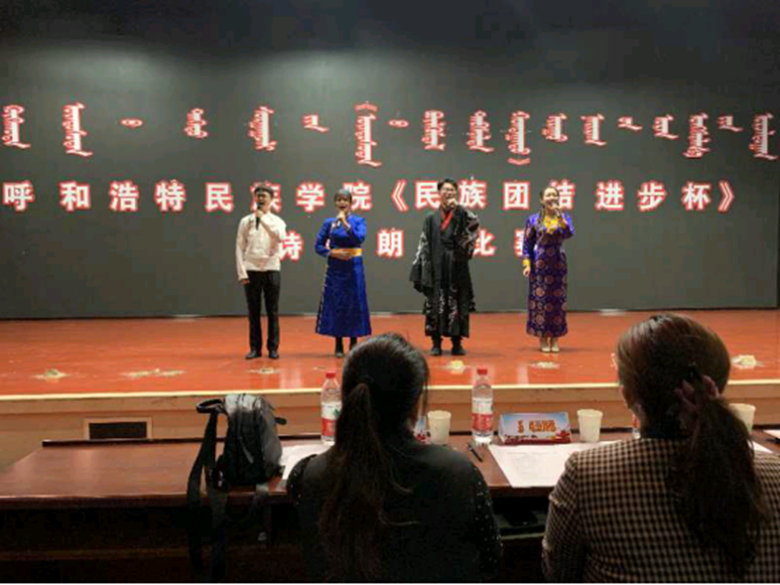 為全面深入持久開展民族團(tuán)結(jié)進(jìn)步創(chuàng)建,引導(dǎo)全校師生進(jìn)一步鑄牢中華民族共同體意識(shí),根據(jù)學(xué)?!睹褡鍒F(tuán)結(jié)進(jìn)步創(chuàng)建示范建設(shè)實(shí)施方案》,蒙古學(xué)學(xué)院(翻譯學(xué)學(xué)院)與文學(xué)院于9月28日在圖書館二樓報(bào)告廳聯(lián)合舉辦“民族團(tuán)結(jié)進(jìn)步杯”主題詩歌朗誦比賽活動(dòng)。學(xué)校統(tǒng)戰(zhàn)部部長(zhǎng)包君、蒙古學(xué)學(xué)院(翻譯學(xué)學(xué)院)黨總支書記周雙喜、文學(xué)院黨總支書記李宏亮等出席大賽。統(tǒng)戰(zhàn)部副部長(zhǎng)包高娃,蒙古學(xué)學(xué)院(翻譯學(xué)學(xué)院)王桂榮教授、富濤副教授、王志博副教授,文學(xué)院教研室烏云高娃主任擔(dān)任評(píng)委。