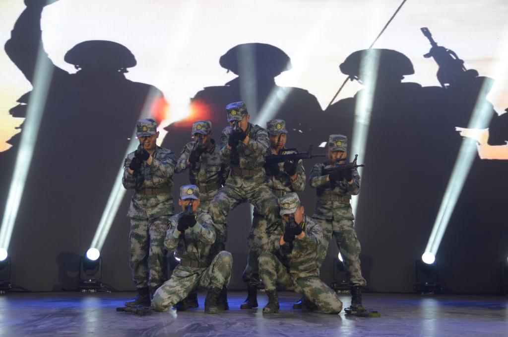 匍匐、翻滾、端槍、瞄準,教官戰術表演動作配合精妙、游刃有余,展現了軍隊硬漢的鐵血本色和高超本領。戰術表演掀起了整場晚會的高潮。