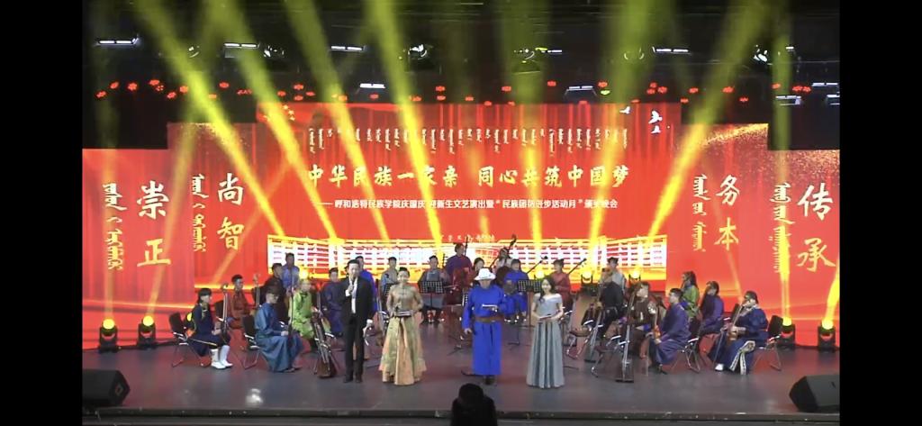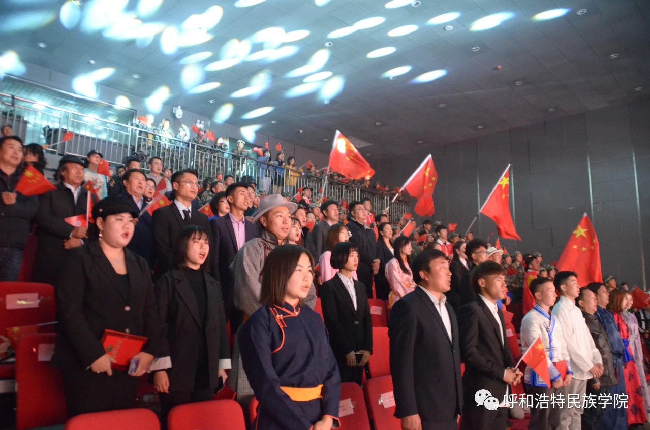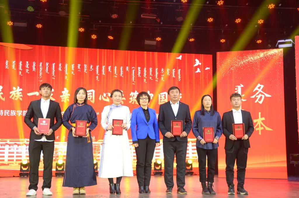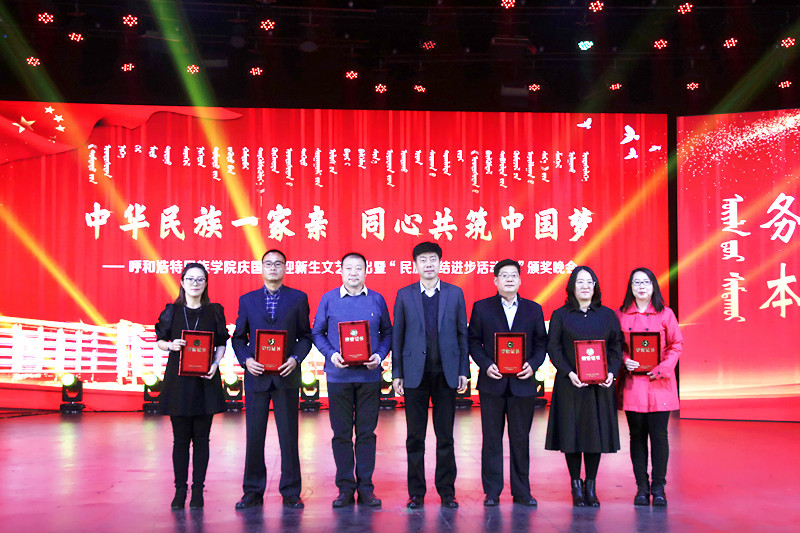 歌舞縈繞,紅旗飄揚,10月25日晚7時,我校“中華民族一家親 同心共筑中國夢”慶國慶、迎新生文藝演出暨“民族團結進步活動月”頒獎晚會在學校演播廳及圖書館報告廳同時舉行。內蒙古自治區民族事務委員會黨組成員、副主任特木勒、呼和浩特市民委四級調研員閆青、呼和浩特市民委社會發展科科長斯日古楞、學校領導、處級以上干部、受表彰集體和個人、師生代表齊聚一堂,共同觀看了演出。