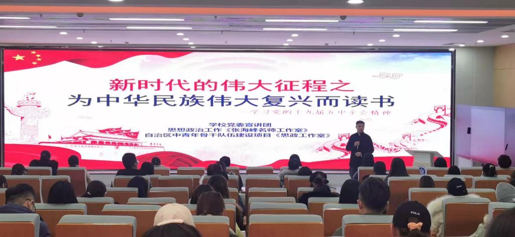 為深入學(xué)習(xí)貫徹黨的十九屆五中全會精神,學(xué)前教育學(xué)院、馬克思主義學(xué)院、音樂學(xué)院聯(lián)合主辦,由學(xué)校黨委宣講團、自治區(qū)思想政治工作“張海峰名師工作室”、自治區(qū)中青年骨干隊伍建設(shè)項目“思政工作室”承辦,于12月10日晚上7點在圖書館一樓思政理論課教學(xué)基地舉辦了“學(xué)習(xí)貫徹黨的十九屆五中全會精神”宣講會。宣講會由學(xué)前教育學(xué)院黨總支書記娜仁其木格主持,學(xué)前教育學(xué)院、馬克思主義學(xué)院、音樂學(xué)院師生代表100余人參加宣講會。