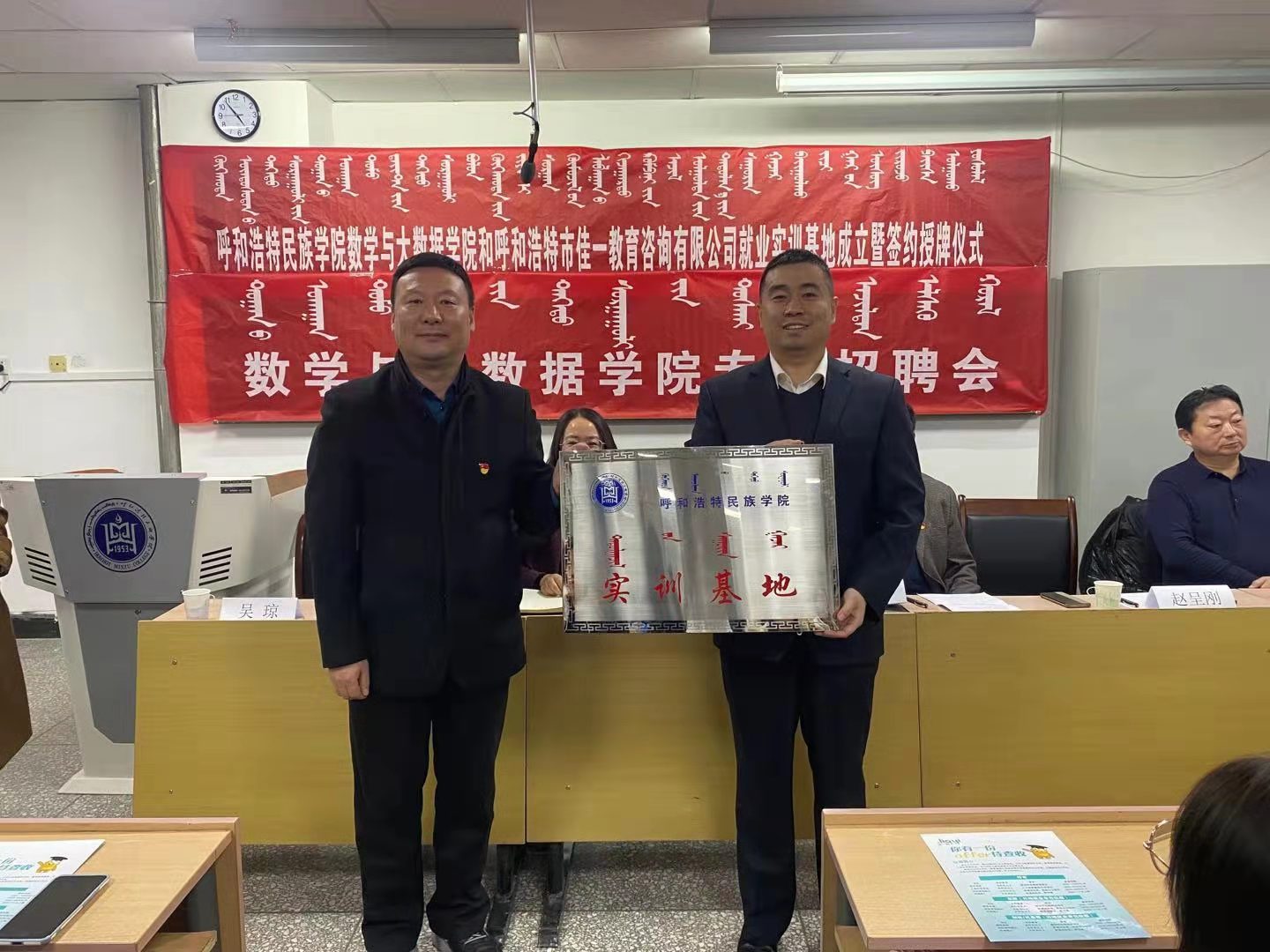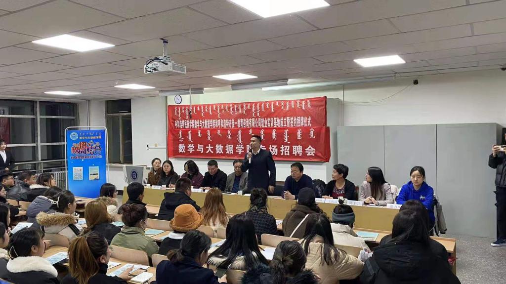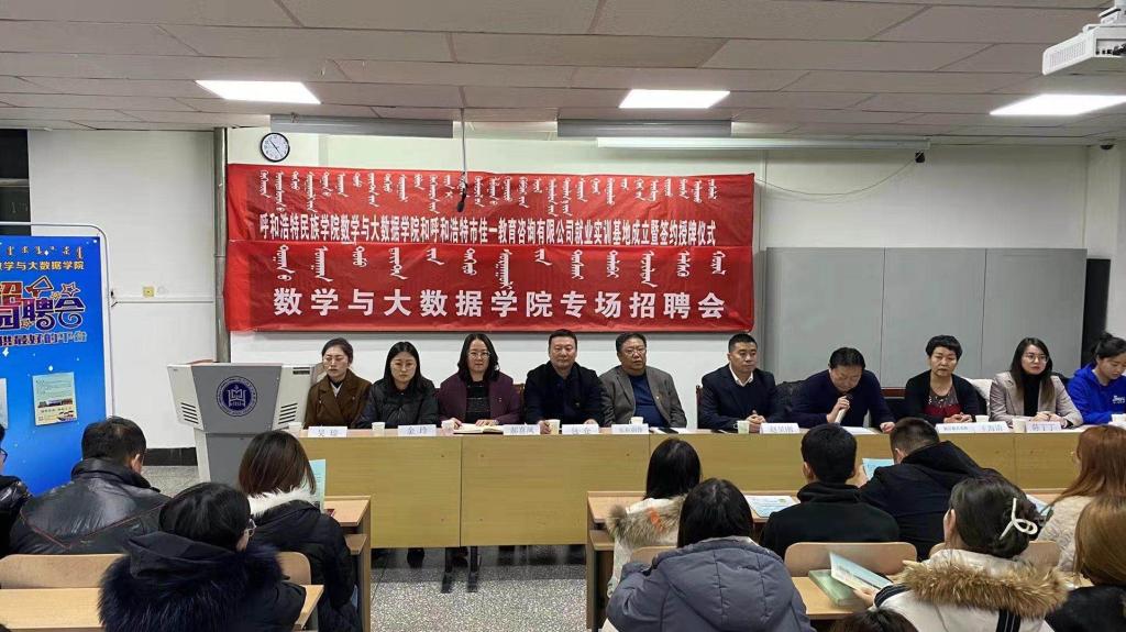 12月18日晚,呼和浩特民族學院數學與大數據學院、呼和浩特市佳一教育咨詢有限公司就業實訓基地成立暨簽約授牌儀式和專場招聘會舉行。今后,數學與大數據學院將與呼和浩特市佳一教育咨詢有限公司開展合作。黨總支書記布和朝魯、院長王海清、黨總支副書記郝喜鳳、副院長額爾頓其其格、輔導員金玲、佳一教育內蒙古區域總監趙呈剛先生、佳一教育人力資源部負責人陳丁丁女士、佳一教育人力專員維力斯女士出席儀式。