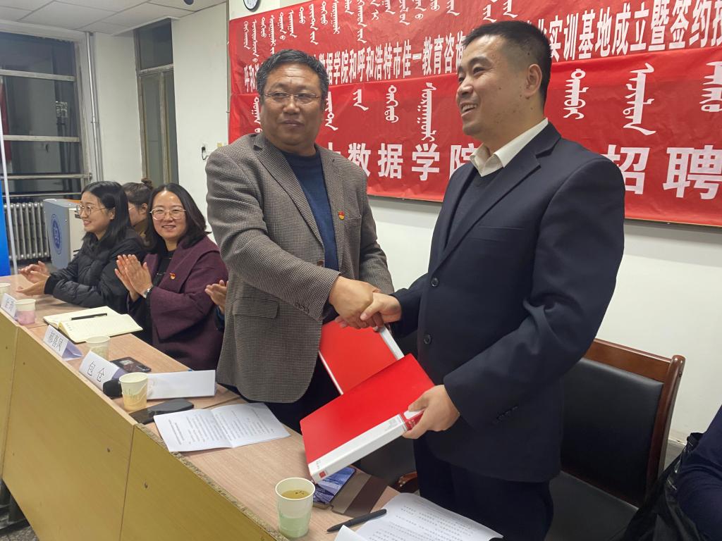 儀式上,我院代表布和朝魯書記與佳一教育代表趙呈剛先生簽訂實訓基地合作書,我校就業指導處處長包倉老師向佳一教育負責人授予實訓基地牌匾。數學與大數據學院院長王海清教授和佳一教育內蒙古區域總監趙呈剛先生先后致辭。