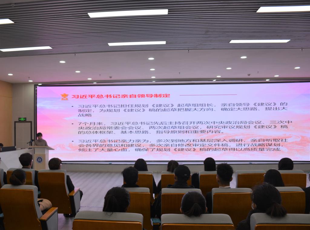 會上,蘇倫高娃老師從黨的十九屆五中全會召開背景、重點內容、重大意義,聚焦新發展階段、新發展理念、新發展格局等方面結合學生會改革方案,進行了全面講解。蘇倫高娃老師要求同學們要準確把握2035年遠景目標和“十四五”時期我國發展的指導思想,勤奮學習、努力工作,為實現“十四五”規劃和2035年遠景目標而團結奮斗。蘇倫高娃老師最后強調,廣大學生干部要原原本本學、聯系實際學,把《建議》確定的戰略部署、工作要求轉化為實際行動;要深刻認識新發展階段的重大意義,增強機遇意識、風險意識,準確識變、科學應變、主動求變,為學校高質量發展貢獻青春力量。