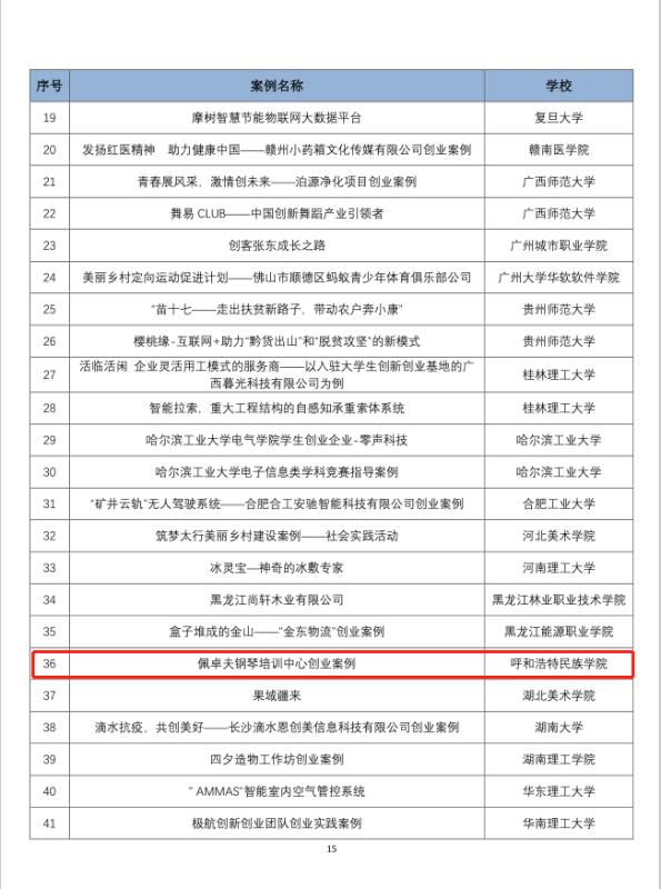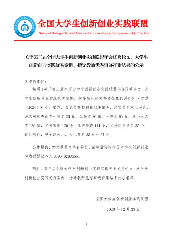近期,我校組織參加《第三屆全國大學生創新創業實踐聯盟年會優秀論文、大學生創新創業實踐優秀案例、指導教師優秀事跡征集》,經實盟專家組評議,共評選出優秀案例120項,優秀論文一等獎20篇、二等獎30篇、三等獎65篇、年會入選獎126篇,優秀事跡111個。我校提交的《佩卓夫鋼琴培訓中心創業案例》榮獲全國大學生創新創業實踐聯盟優秀案例獎。
