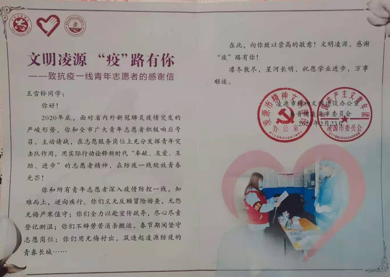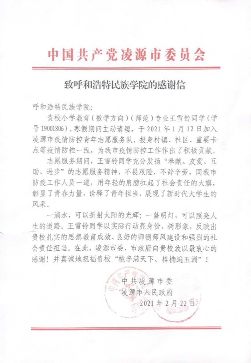 近日,學校團委收到了一封來自中共凌源市委,凌源市人民政府的感謝信。信中表揚了我校數學與大數據學院2019級小教二班王雪鈴同學在疫情高發期主動加入凌源市疫情防控志愿服務,勇挑重擔、表現積極,以實際行動彰顯了民院學子的精神面貌,高度的社會責任感,體現了新時代青年的使命擔當。