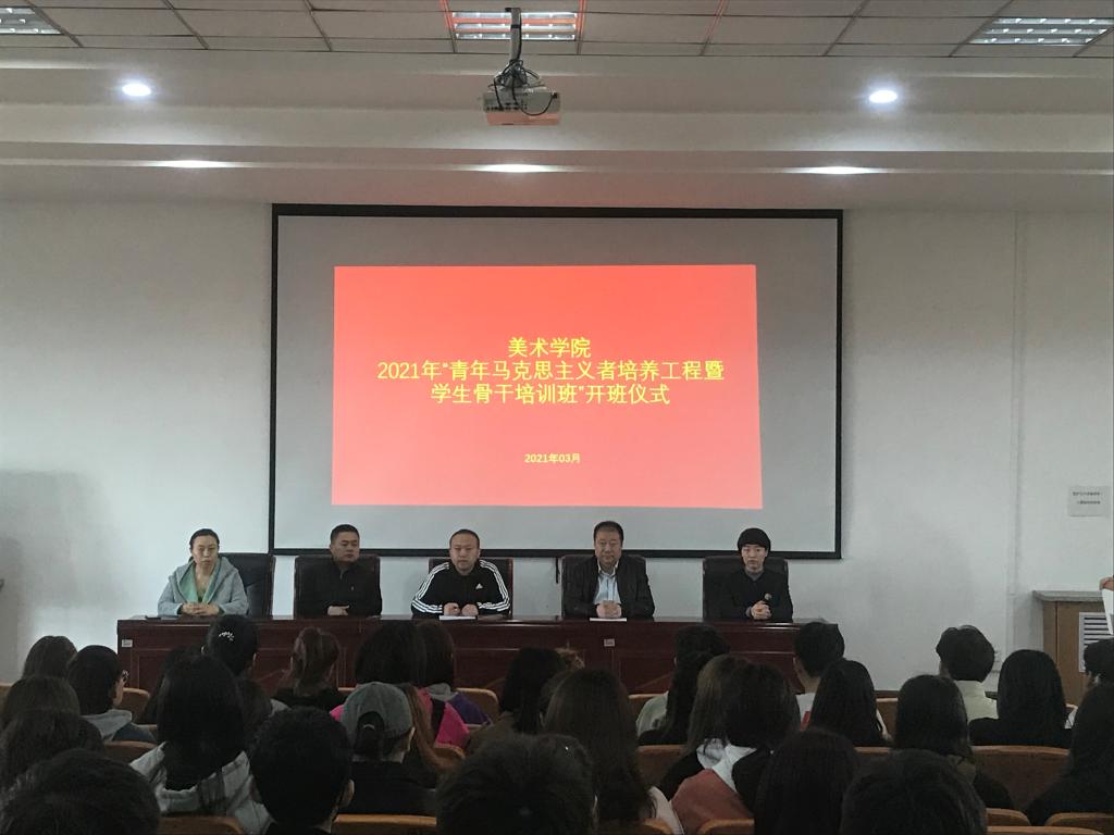 為了深入實施青年馬克思主義者培養工程,不斷提高學生的思想政治素質,積極投身理論學習,深入學習實踐習近平新時代中國特色社會主義思想,教育引導青年學生做新時代中國特色社會主義的“踐行者”。3月12日上午,美術學院在美術樓四樓階梯教室舉辦了“2021年青年馬克思主義者培養工程暨學生骨干培訓班”開班儀式。會議由美術學院團總支副書記魏偉主持,美術學院學生干部、入黨積極分子等110多名同學參加學習,學校團委副書記白銀亮,美術學院黨總支書記包旭東,黨總支副書記吳利春,副院長高特木樂,副院長塔娜參加了本次開班儀式。