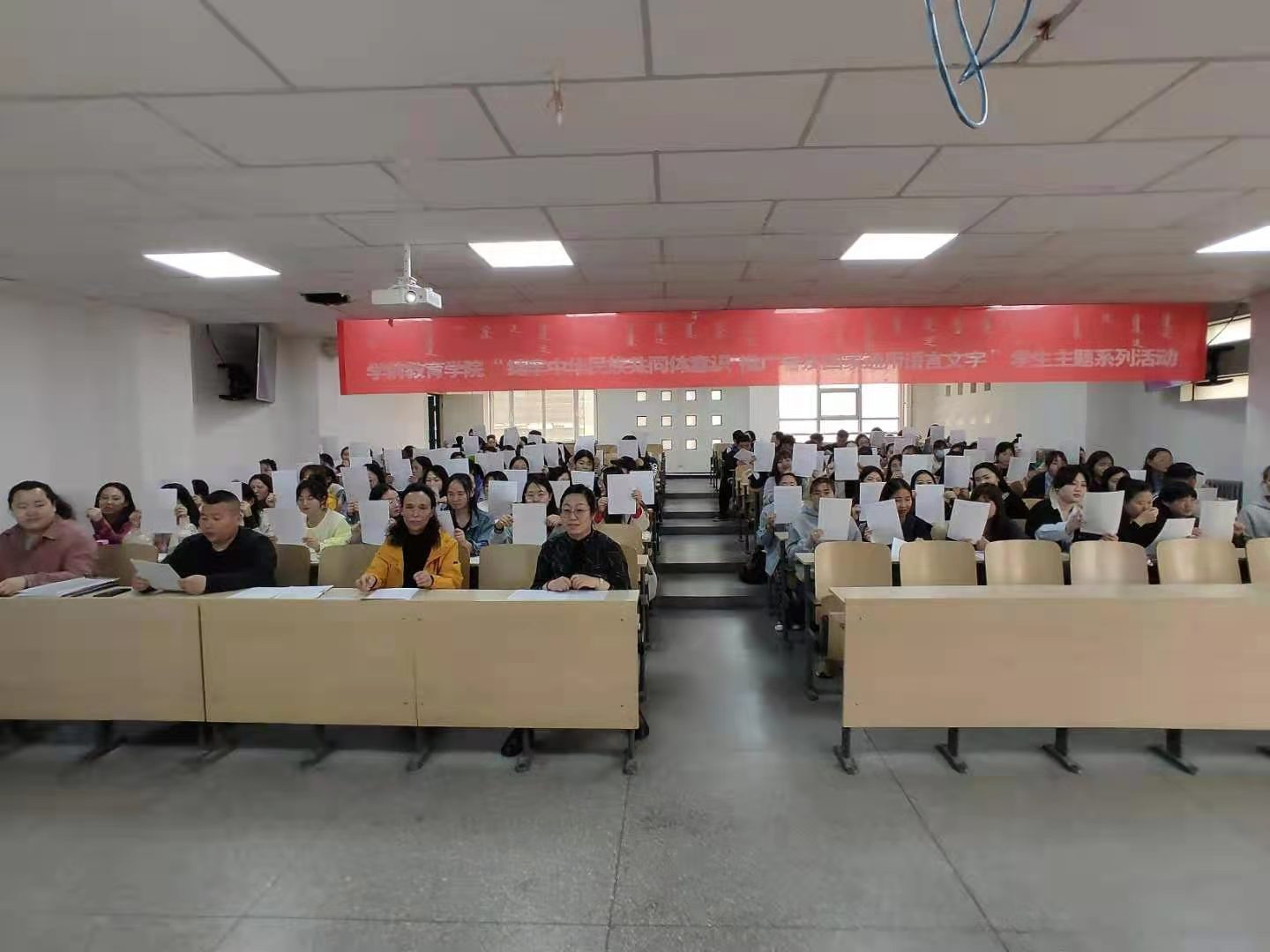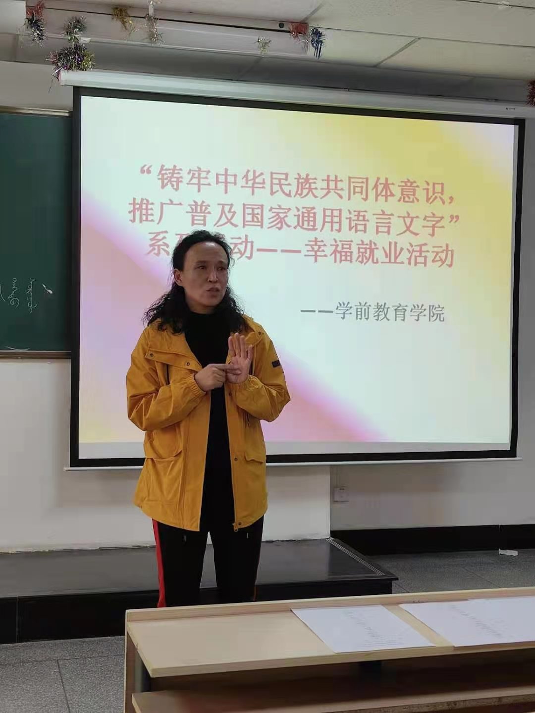 學(xué)前教育學(xué)院于4月15日上午在尚志樓214開展了“鑄牢中華民族共同體意識 推廣普及國家通用語言文字”支“幸福就業(yè)”活動。學(xué)前教育學(xué)院娜仁其木格書記、斯日古冷老師、張璟華老師、梅花老師及2021屆128名畢業(yè)生參加會議。