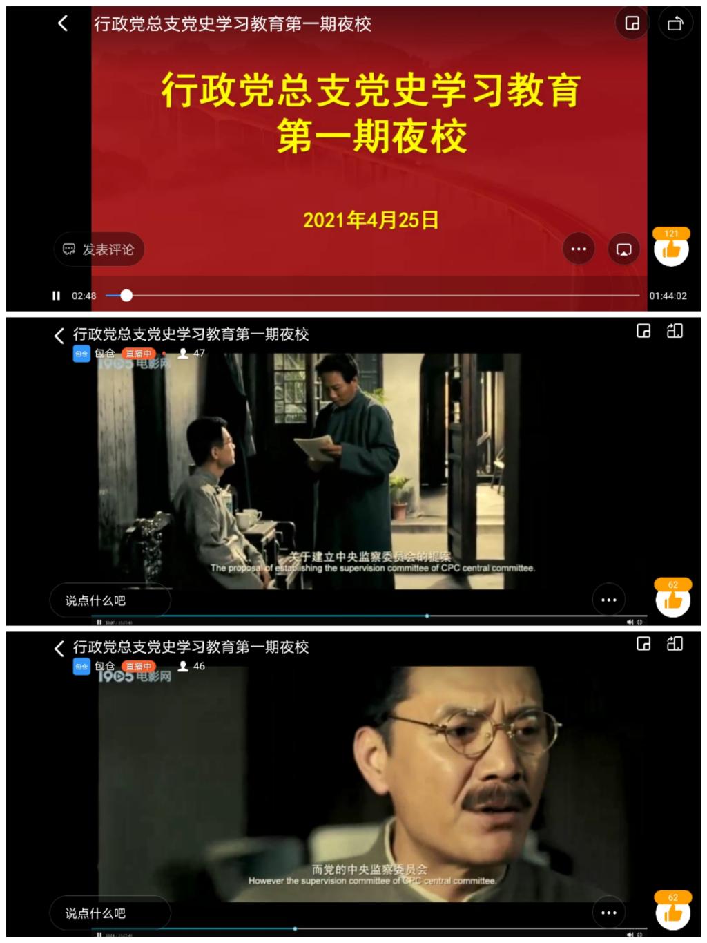 4月25日晚上7時40分,通過釘釘直播形式,舉辦了黨總支黨史學習教育第一期夜校,向全體黨員和處級干部播放了黨史愛國主義影片《忠誠與背叛》,影片通過真實感人的故事、豐滿生動的人物形象,譜寫了第一屆中央監察委員會成立、十名監察委員忠于職守、為黨履職的光輝篇章,著力塑造了中央監察委員會第一任主席王荷波、副主席楊匏安的英雄形象,熱情謳歌了老一輩黨的紀監干部威武不屈、剛正不阿、忠于革命、視死如歸的大無畏革命精神。使廣大黨員和干部收到了心靈的洗禮和進行了很好地對黨忠誠、對國家忠誠、對人民忠誠的黨性教育。