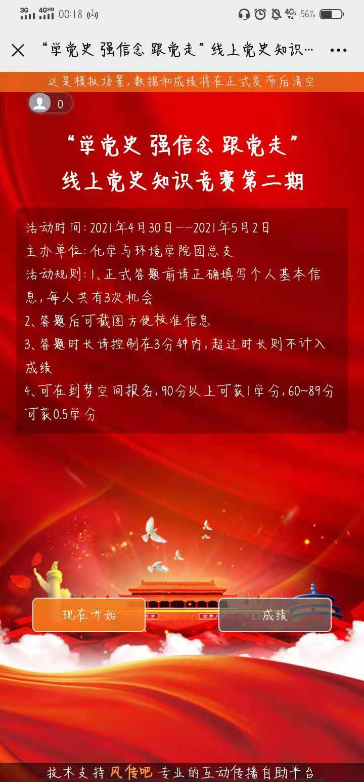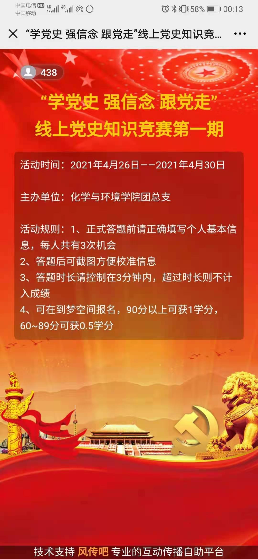 為慶祝中國共產黨建黨100周年,重溫中國共產黨光輝歷程,進一步激發學生愛黨、愛國熱情,堅定理想信念,化學與環境學院近日舉辦了兩期線上黨史知識競賽。本次線上知識競賽以學院微信公眾平臺和“到夢空間”系統為依托,圍繞中國共產黨黨史為核心,選取中國近現代史各階段內容,包括革命史、新中國史、改革開放史、社會主義建設發展史等內容,目前已推送兩期,參與人次達651人次,基本做到了全覆蓋。