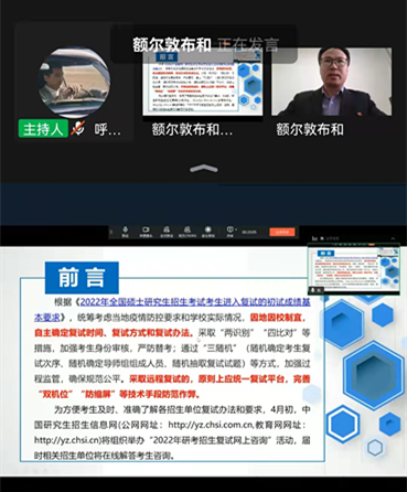 額爾敦布和教授分析研判了2022年全國碩士研究生招生總體情況,簡要介紹了疫情期間的面試流程、形式以及今年招生進度,并就考生如何做好各環(huán)節(jié)復試準備進行了全面指導。他指出,考生要做到環(huán)節(jié)通透,不打無準備之仗,預先熟悉復試全流程和復試科目內容;要了解線上復試注意事項,準確研判招生院校相關措施,保證復試過程順暢進行;要放平心態(tài),認真?zhèn)淇迹\信考試。