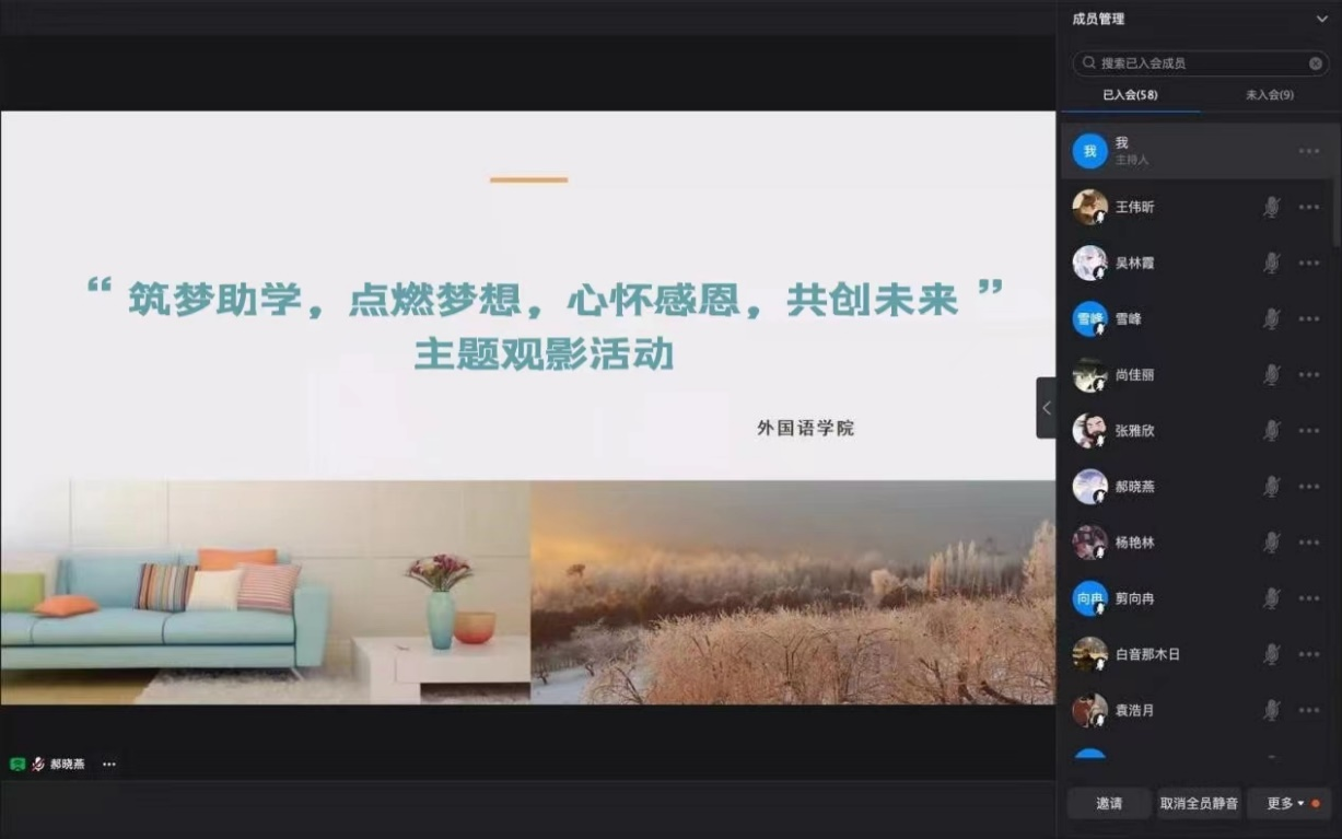 為進一步加大學生資助政策宣傳力度,助力鞏固拓展教育脫貧攻堅成果與鄉村振興有效銜接,激勵受助學生奮發自強、立志成才、感恩奉獻,外國語學院于5月28日—5月31日線上舉辦“助學筑夢,點燃夢想,心懷感恩,共創未來”主題觀影活動。本次活動由學院資助工作負責人王春梅老師主持,學院全體受資助學生參加。
