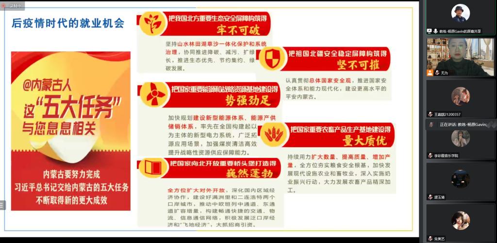 為深入學習貫徹黨的二十大精神,充分認識黨的二十大的重大意義和豐富內涵,積極響應國家就業政策號召全力推進2023屆畢業生就業工作,音樂學院于12月13日下午舉辦了《做一個創業型的就業者》為主題的線上就業指導講座。主講人為中國國際“互聯網+”大學生創新創業大賽評委楊原老師。學校就業指導中心主任包倉及音樂學院全體師生參加了本次講座,講座由學院團學負責人包為為主持。