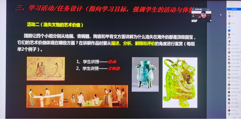 郭璇老師以《淺談核心素養下的高中美術教學》為題,從中學美術學科素養、深度學習、個人教學設計和新課標下美術教師的角色定位等四個方面,結合自己多年的教學經驗和教學成果,重點講解了如何通過美術課教學提升學生核心素養,如何激發學生的學習內驅力,高中美術課設計以及結合案例如何塑造美術教師素養等方面的內容。
