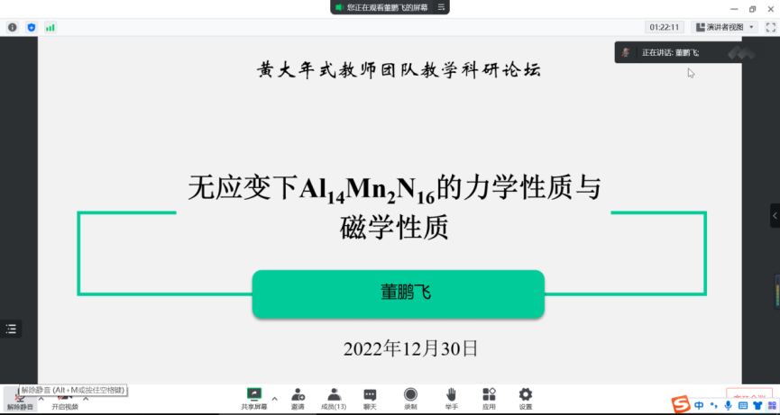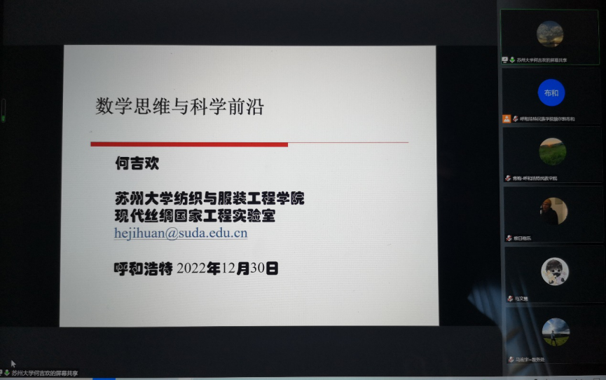 2022年12月30日,我校全國(guó)高校黃大年式教師團(tuán)隊(duì)線上舉辦了2022年度教學(xué)科研論壇。團(tuán)隊(duì)特別邀請(qǐng)?zhí)K州大學(xué)博士生導(dǎo)師何吉?dú)g教授和內(nèi)蒙古師范大學(xué)博士生導(dǎo)師套格圖桑教授作專題報(bào)告,教務(wù)處處長(zhǎng)額爾敦布和教授、數(shù)學(xué)與大數(shù)據(jù)學(xué)院副書記郝喜鳳、副院長(zhǎng)額爾敦其其格和團(tuán)隊(duì)全體成員、研究生及高年級(jí)本科生共120余人參加本次論壇。