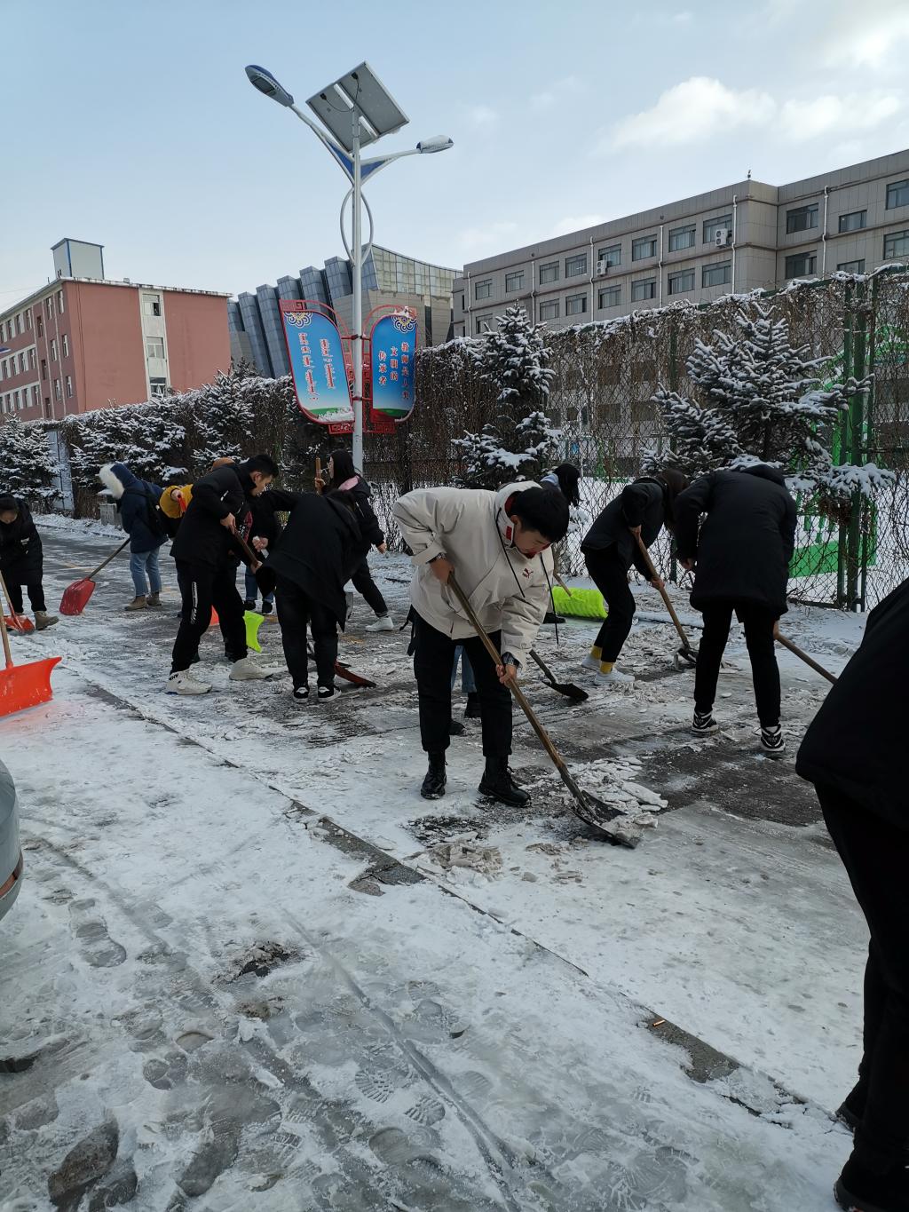 在活動中,同學們手持鐵鍬、掃帚等工具,以小組為單位分工協(xié)作,積極配合除雪工作,為清理出一條條安全的通道,同學們不顧天氣嚴寒,盡管雙手被凍的通紅,也絲毫沒有阻擋同學們積極除雪的熱情,同學們勞動的身影成為校園內(nèi)一道亮麗的風景線。在除雪過程中,同學們有的鏟、有的掃,干勁十足,經(jīng)過兩個多小時的努力,終于將道路打掃干凈。