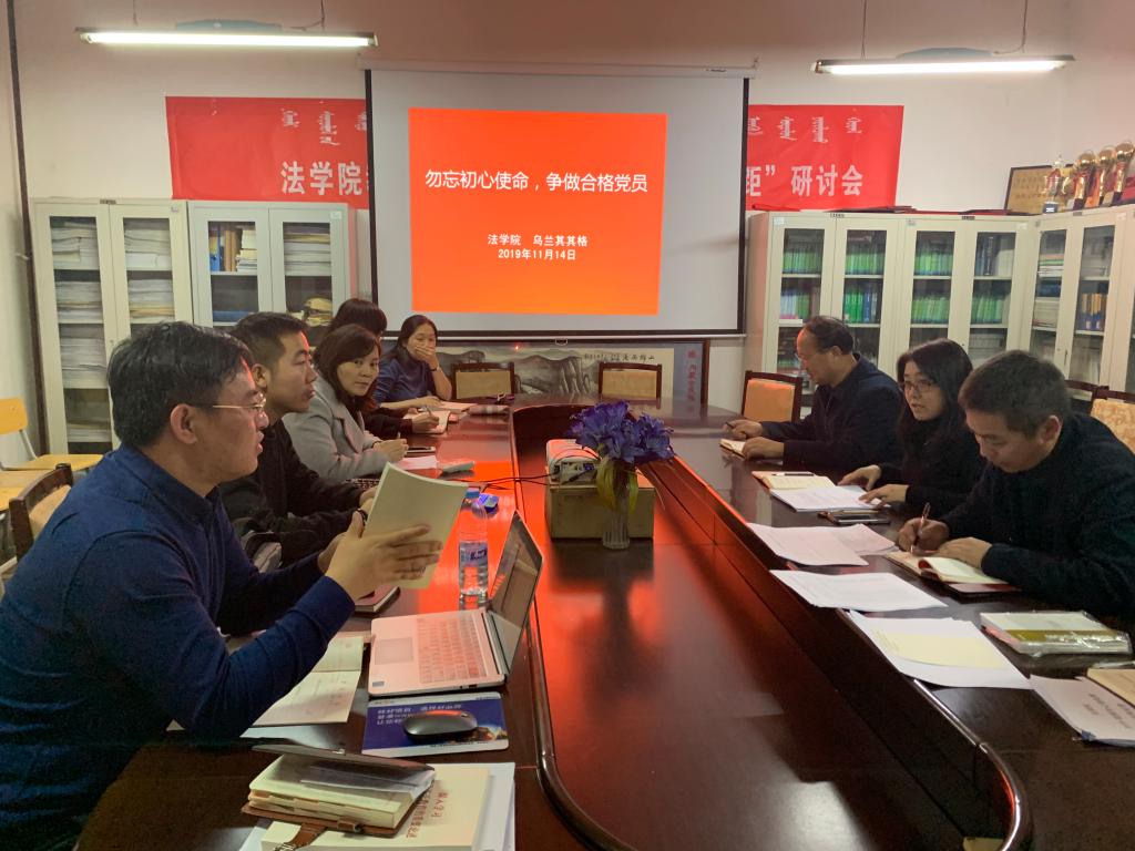 11月14日下午,法學院黨總支書記烏蘭其其格在學院會議室以《勿忘初心使命、爭做合格黨員》為題,為學院全體教工黨員上了一堂“不忘初心、牢記使命”主題教育專題黨課。