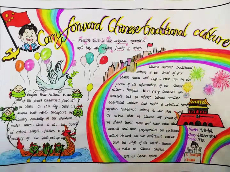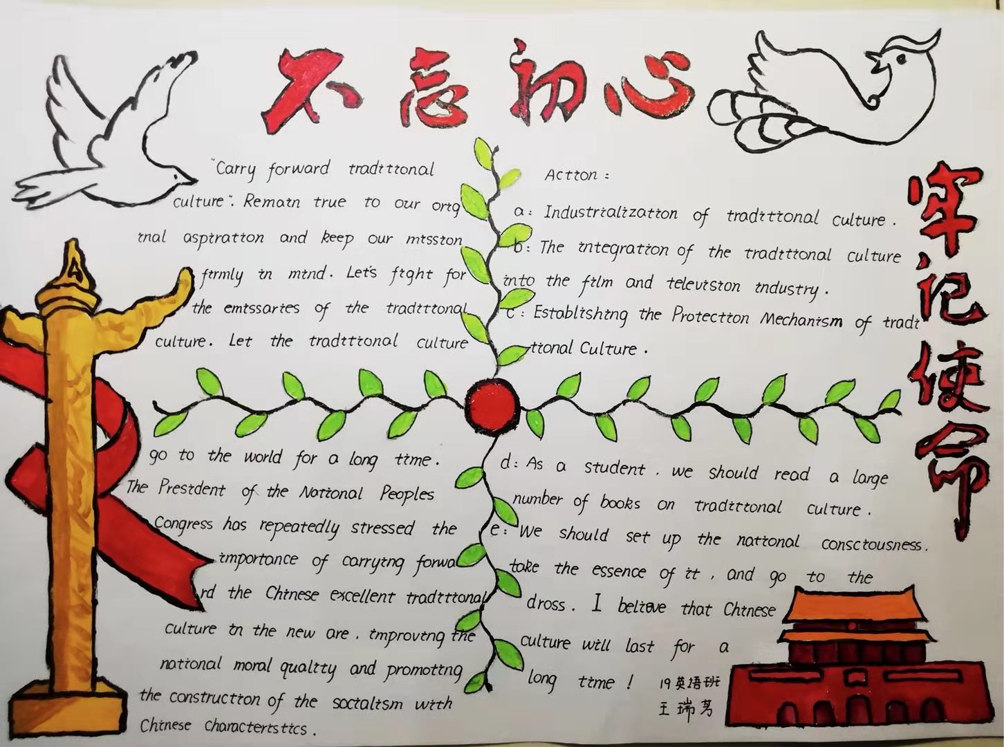 為推進“不忘初心、牢記使命”主題教育進一步深入,激發學生守初心、擔使命的責任感,11月8日——11月12日,外國語學院于都林樓舉辦了“不忘初心、牢記使命”之弘揚傳統文化主題手抄報活動,活動共征集到21幅手抄報作品。